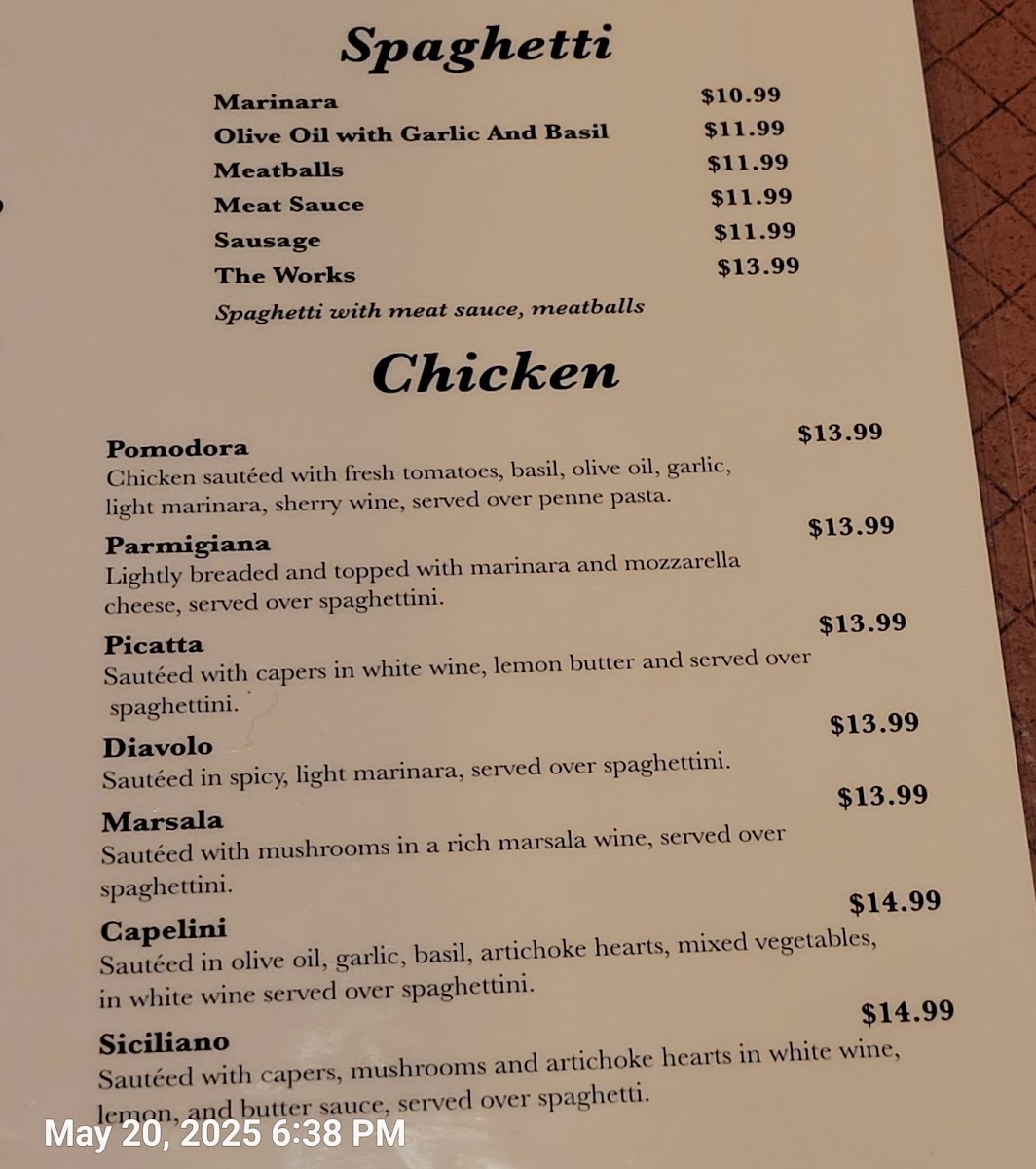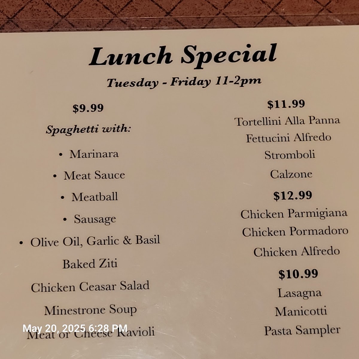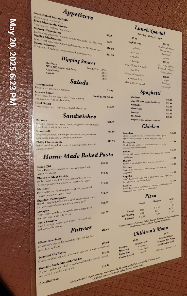The menu highlights include comforting favorites like Chicken Alfredo and Spaghetti the Works, alongside more specialty selections such as Lobster Ravioli and Chicken Siciliano. These dishes invite diners to enjoy a meal that is both familiar and richly flavorful, fitting well with the cozy, unpretentious atmosphere of the restaurant.