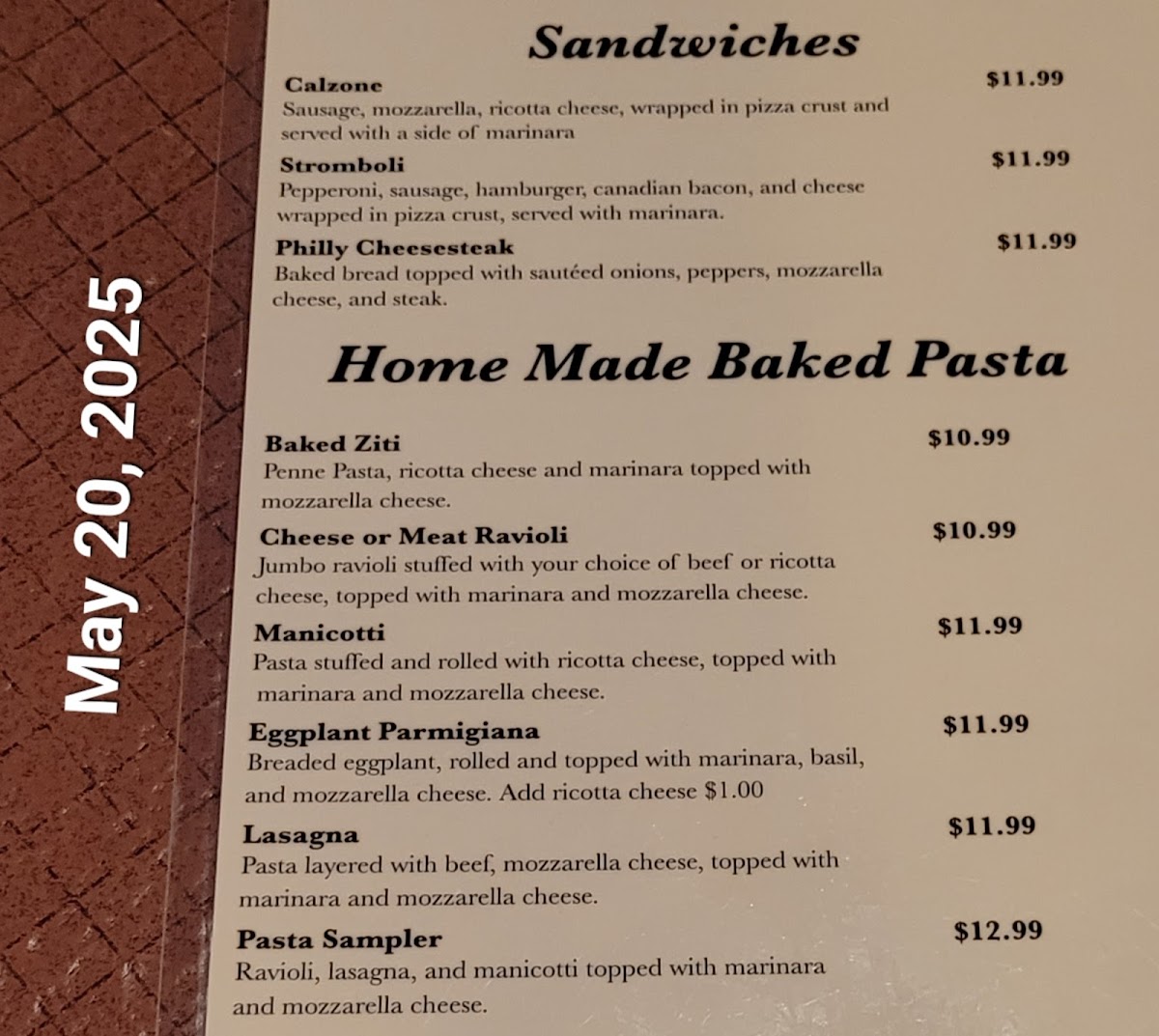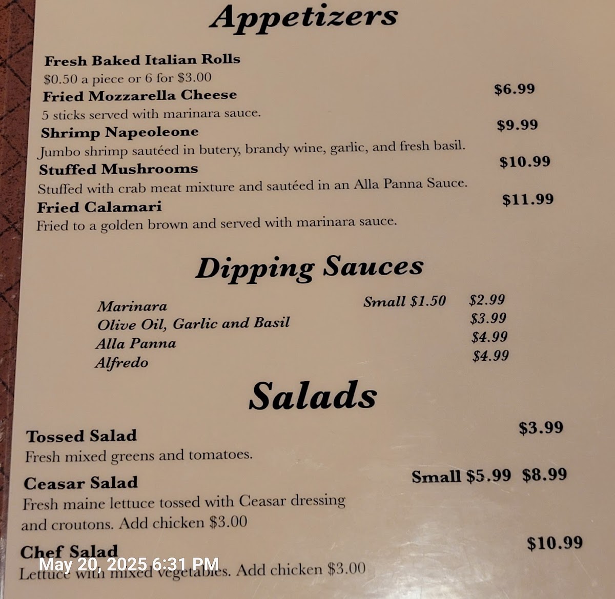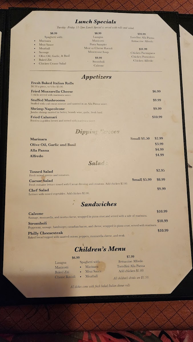 The menu highlights include comforting favorites like Chicken Alfredo and Spaghetti the Works, alongside more specialty selections such as Lobster Ravioli and Chicken Siciliano. These dishes invite diners to enjoy a meal that is both familiar and richly flavorful, fitting well with the cozy, unpretentious atmosphere of the restaurant.