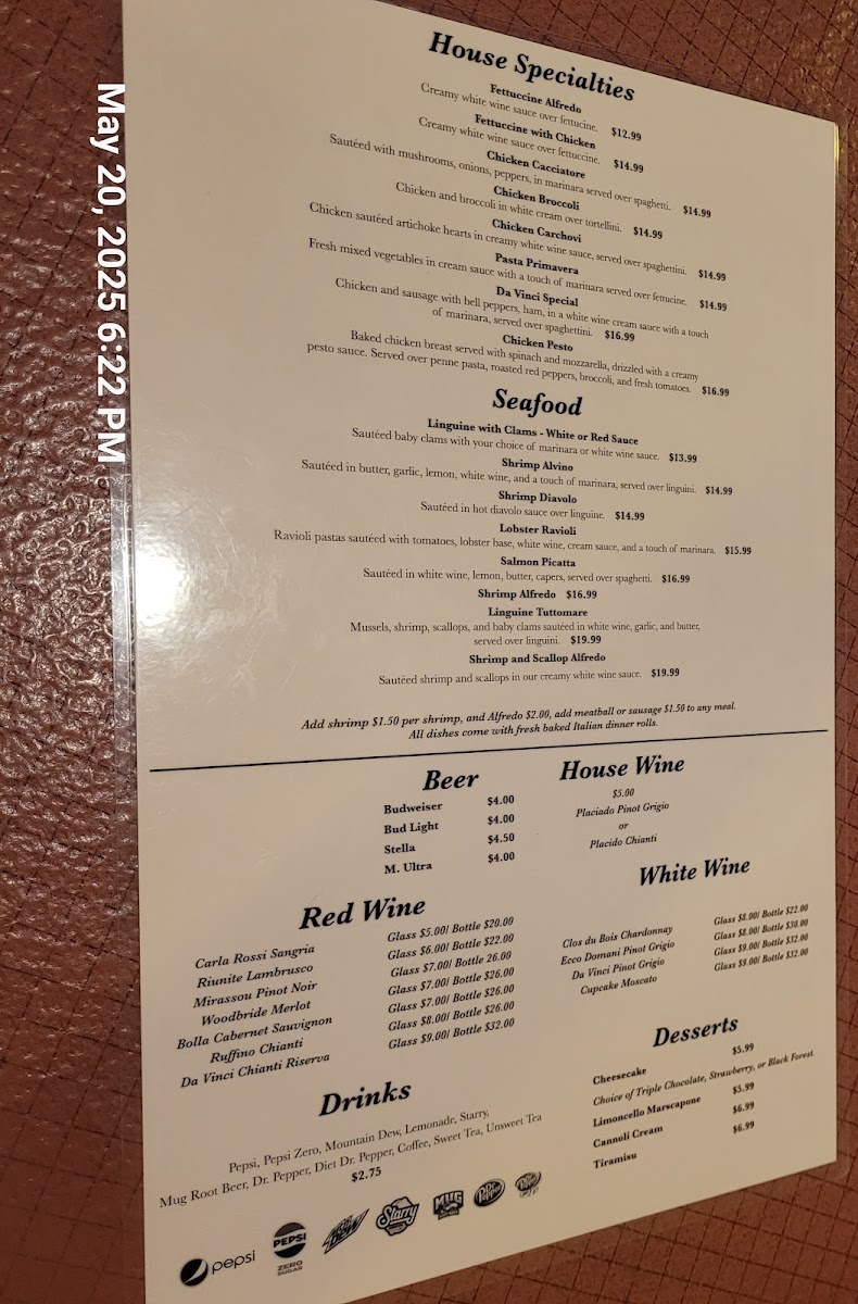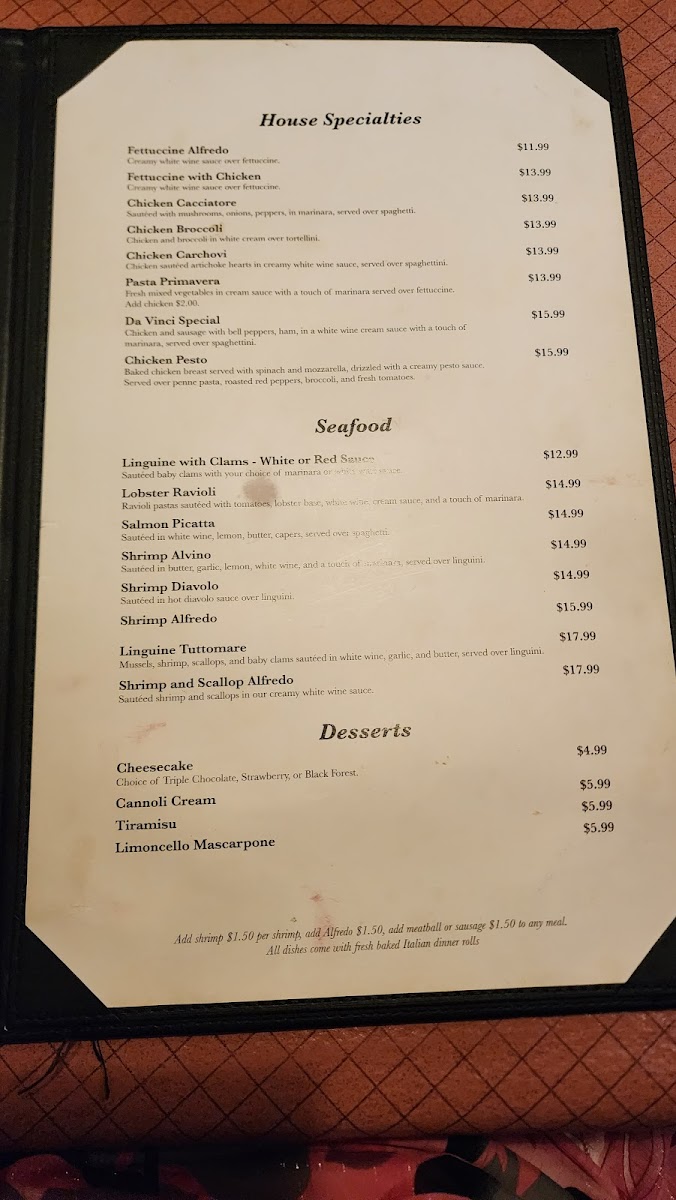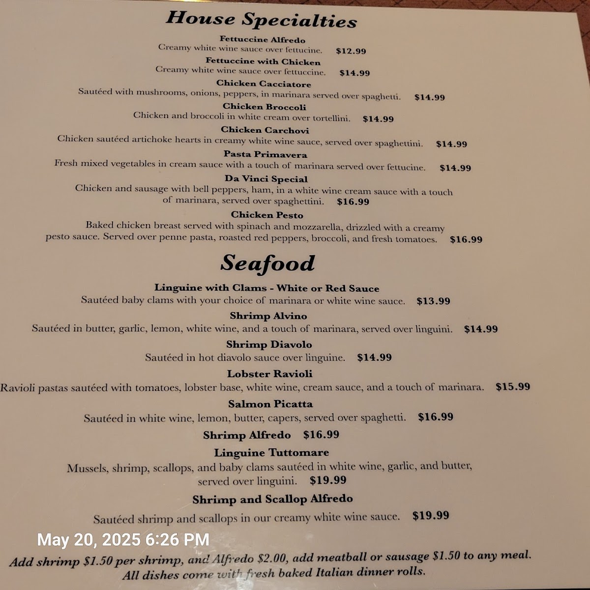 DaVinci Italian Restaurant offers a menu rooted in classic, hearty Italian dishes that suit both casual lunches and relaxed dinners. The selection feels approachable and comforting, with options ranging from warm, savory soups and fresh salads to satisfying pasta plates and thin-crust pizzas.